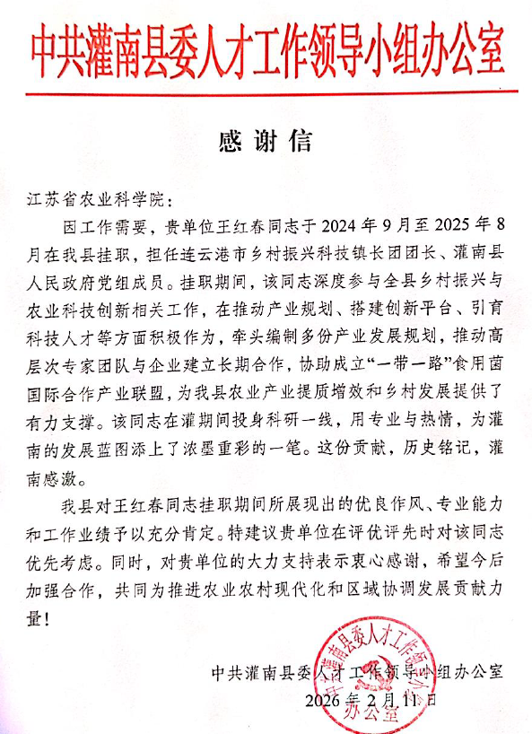 日前,灌南县人民政府致信我院植保所,感谢植保所副所长王红春在挂职期间付出的辛勤努力、作出的积极贡献,予以充分肯...【详情】